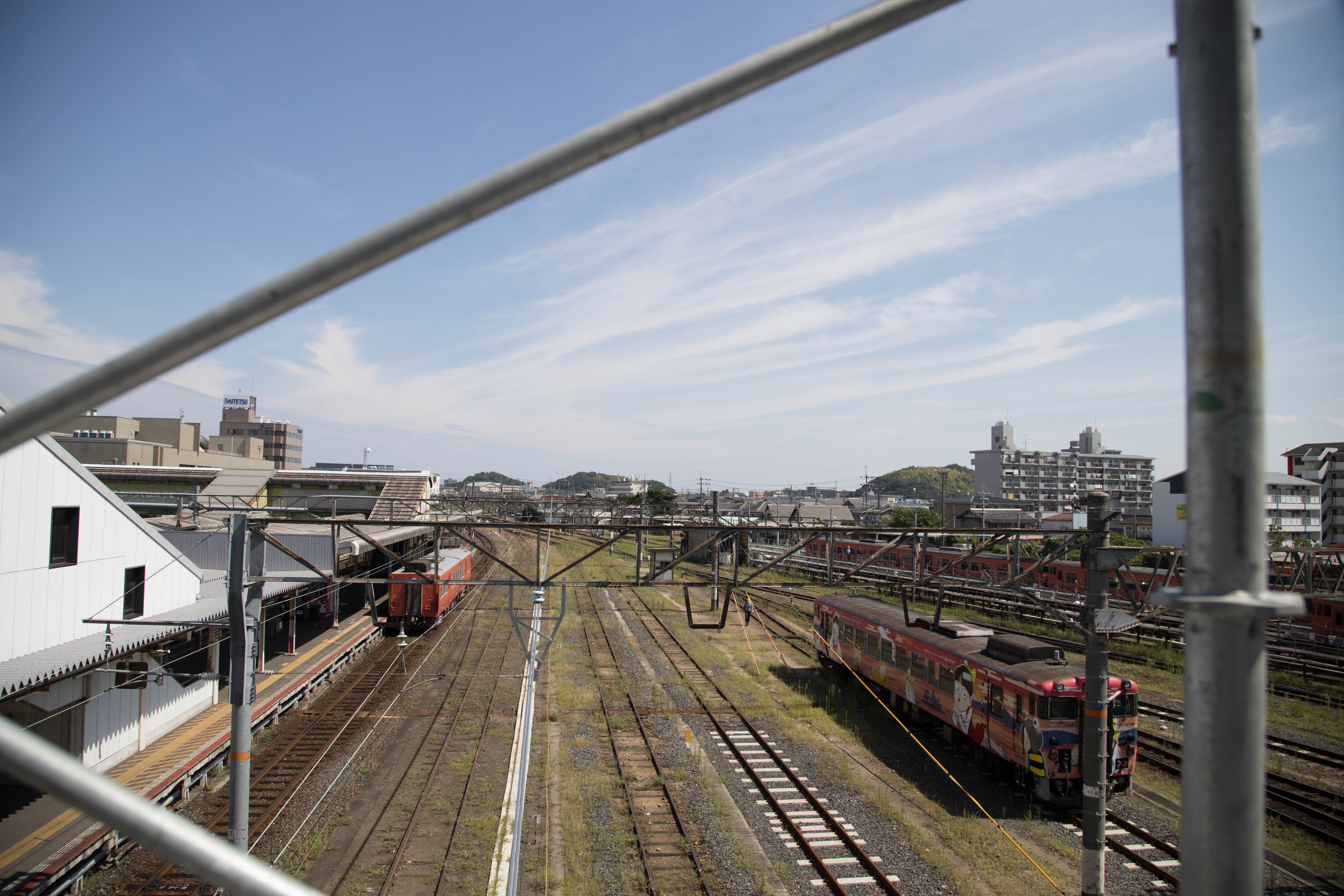 今回、関係者で自由通路を現場視察する機会がありました。皆さんに現時点で見える風景がどんなものかお伝えしたいと思います。 まず通路から駅北広場を見た風景です。 駅前通りが一直線に自由通路から延長して繋がっているように見えました。左奥には米子城跡が見えます。 次は振り返ると 幅6メートル、長さ140メートル(現段階では線路間の施工なので105メートル)の通路が広がっています。床は梁の上にデッキプレートと呼ばれる型枠を兼ねた鋼板が溶接されている状態でした。9月中旬にコンクリートを敷く予定となっており、その作業はまた通信で報告したいと思います。 次は通路の途中に設置される展望スペースからの風景です。側面に防護ネットが張られているので柱などが映り込みます。まずは松江方面です。 鉄道ファンに知られている扇形車庫は、ホームから見るよりも遠いのですが少し上からの角度で見ることができます(転車台は見えません)。洗車に向かう187系や点検に向かう126系など、色とりどりのディーゼル車の往来する姿を時刻表に関係なく気軽に眺めることができそうです。 続いて反対側の鳥取・岡山方面です。 こちらからの景色で気になるのは「大山が見えるかどうか」だと思うのですが、残念ながら防護ネットが外れても稜線の一部が少し見える程度のようです。 見下ろすとメンテナンスを待つキハ40形(ねこ娘列車)が停車している姿が確認できましたので、入場券なしでのんびり車両を楽しむことができるのではないでしょうか。 自由通路南側の端から見える風景は、基礎工事をしている広場とマンションだけでしたので、今回写真は割愛します。 今後も、進捗状況にあわせて通路から見える風景の写真をお伝えしますのでお楽しみに。