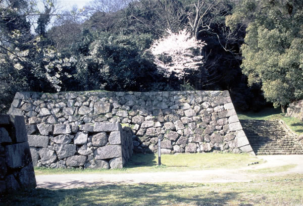 現在、二の段郭の角櫓跡付近に東屋があります。本丸へ向けた石垣は崩落埋没し、一部が残存しています。
