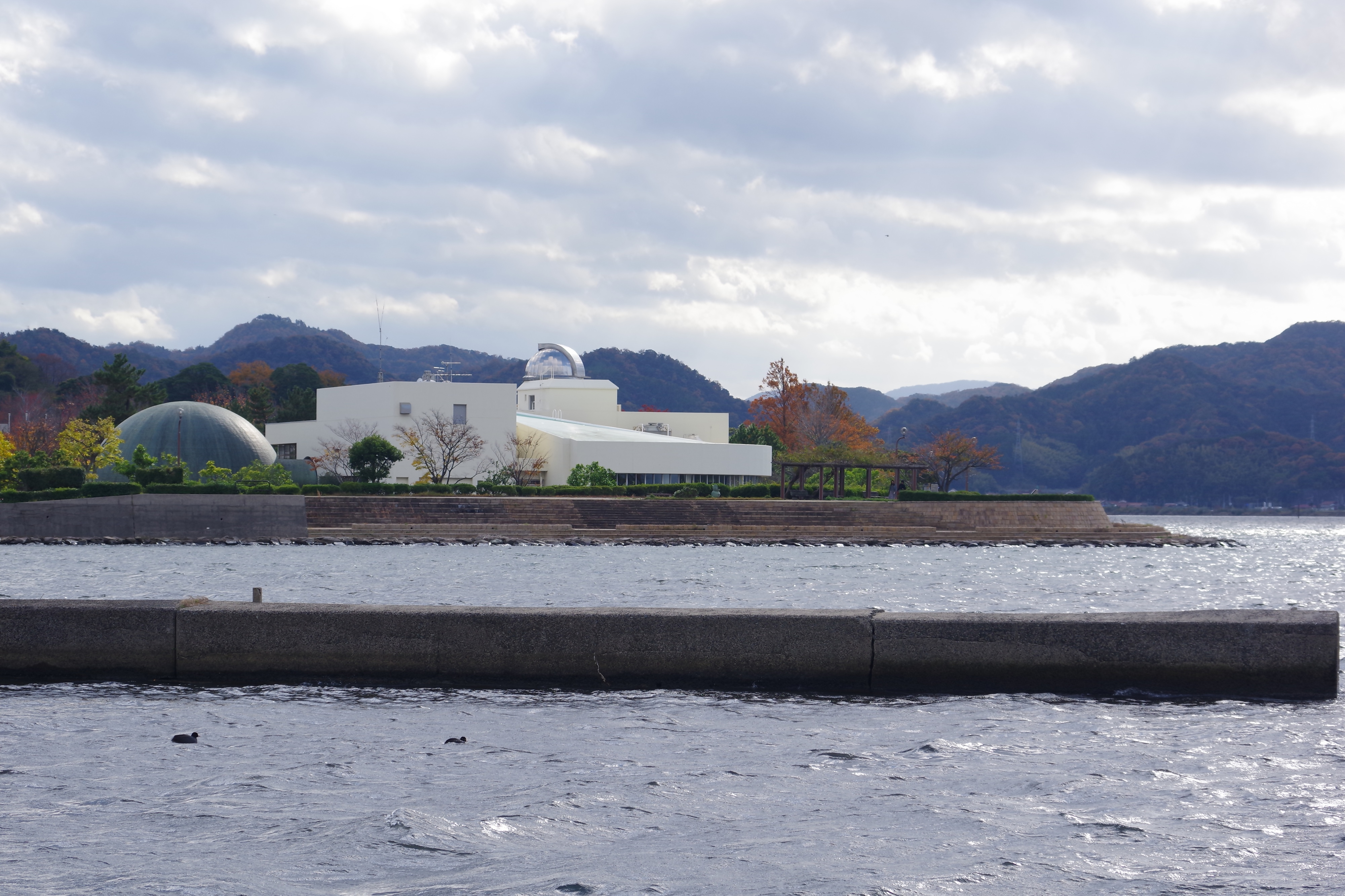 遊歩道に面する米子市児童文化センターは、銅板葺き・円形の屋根を持つプラネタリウム棟が特徴的で、経年変化による緑青が周辺の松林と調和しています。中海湖岸の景観は、市民や各種団体等の協力で支えられています。