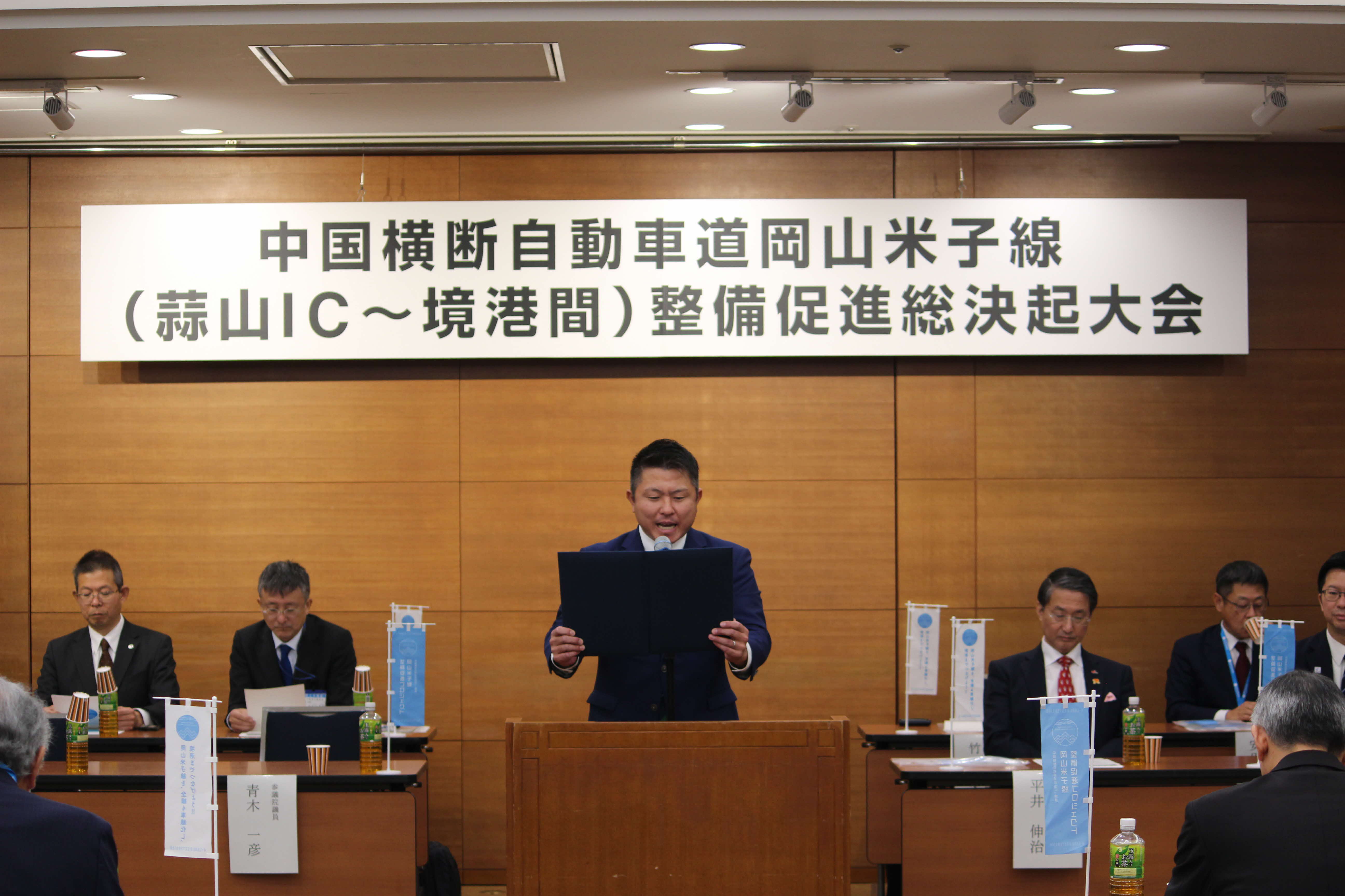 竹口副会長(大山町長)から決議案が読み上げられ、米子境港間の高規格道路の早期事業化、岡山米子線の全線4車線化早期実現及び高規格道路ネットワークの構築に係る予算確保を訴えていくことが大会決議として採択されました。