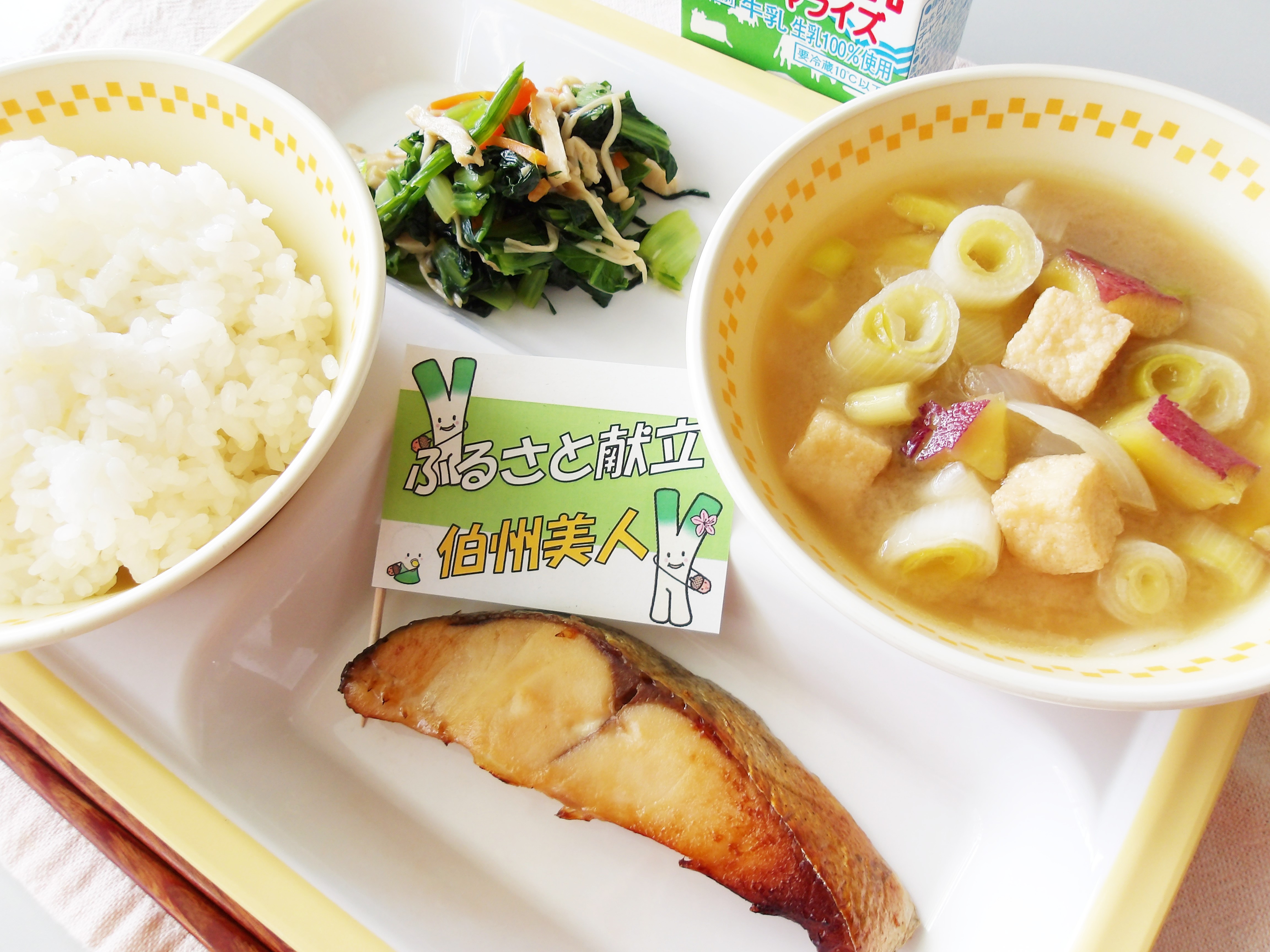 地元食材を使った給食メニューを提供することにより、子どもたちに地元の食材をおいしく味わってもらうとともに、地元への意識・関心を高め、児童生徒に対する食育の推進を図るため「伯州美人」を使った献立を提供しました。「伯州美人」は一般的に栽培されている品種に比べ、太くて柔らかくて、甘みが強いのが特徴の白ねぎです。収穫量が少ないため、一部の学校での実施となりました。これからも地産地消の取り組みを積極的に進め、学校給食を通じて、地元の豊かな食材や食文化に親しんでもらえるよう努めます。