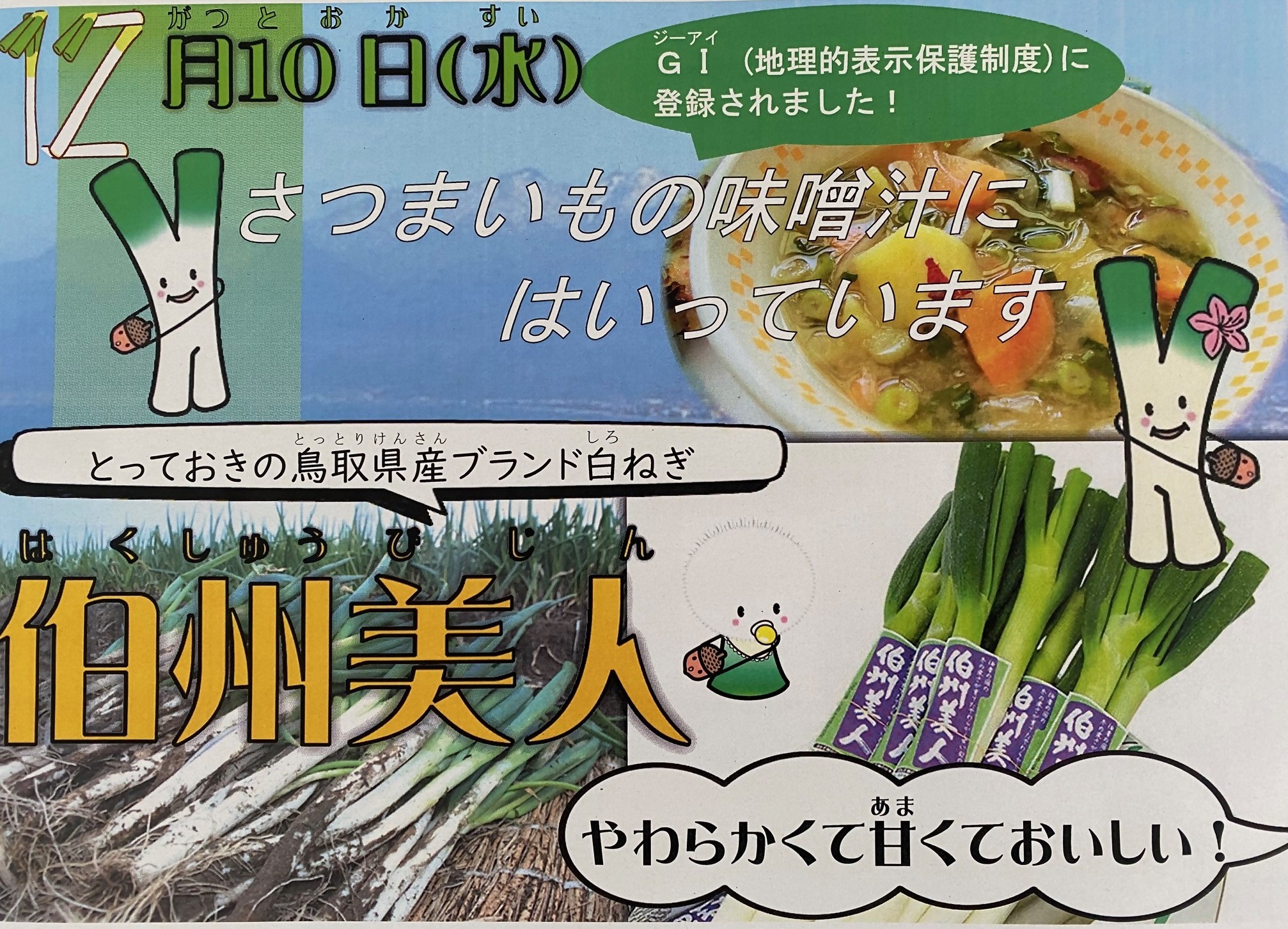 令和7年12月10日(水曜日)市内の一部の小中学校で、米子市の特産品であるブランド白ねぎ「伯州美人」を使用した献立を提供しました。