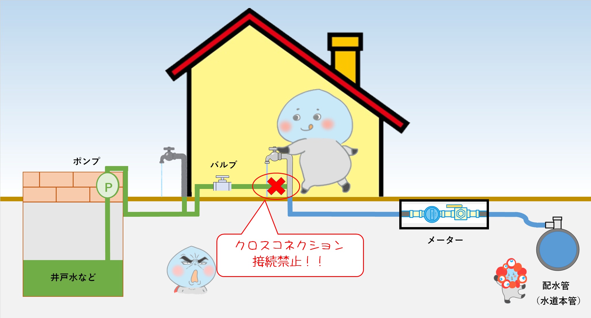 水道の給水管と水道以外の管が接続されていると、バルブの故障や操作不良、閉め忘れなどにより井戸水等が配水管(水道本管)に逆流するおそれがあります。