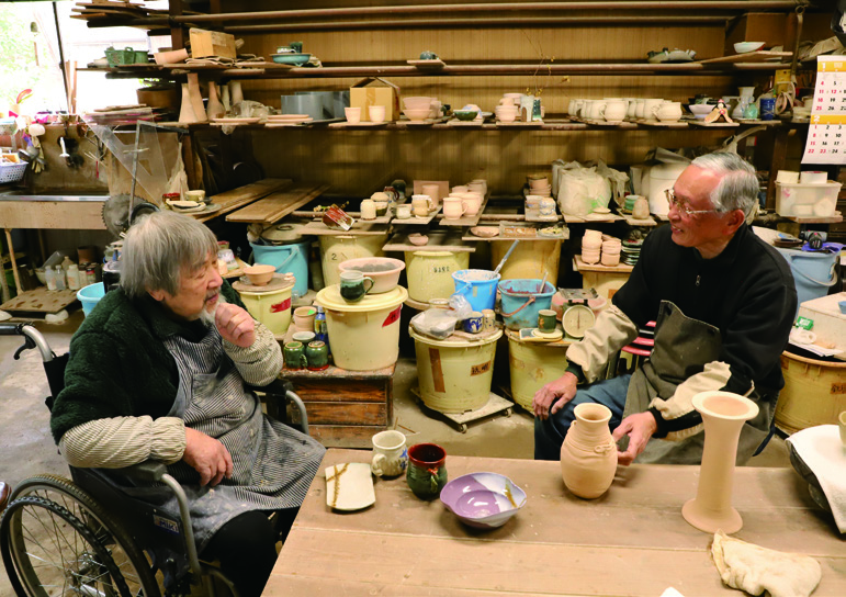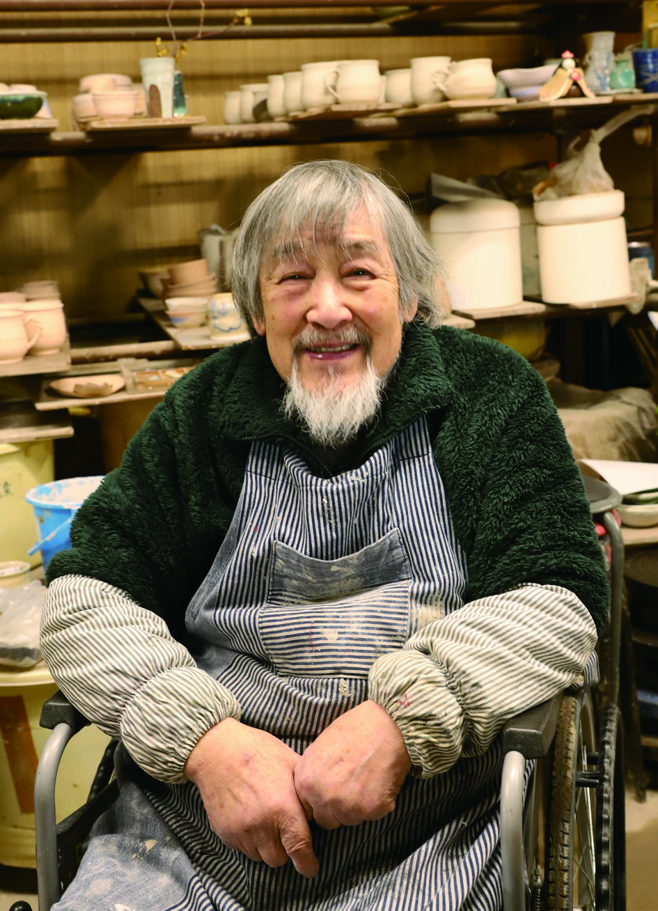 皆生温泉のほど近くにある法勝寺焼皆生窯。二代目の安藤釉三さんは今年82歳を迎えました。3年ほど前から車いすでの生活を続けていますが、今もなお、意欲的に作陶に励んでいます。「南部町の法勝寺焼の脇窯として、父の代に皆生で築いたのが皆生窯。私が本格的に陶芸の道に入ったのは高校卒業の春。気がつけば60年以上になります」と穏やかに語ります。