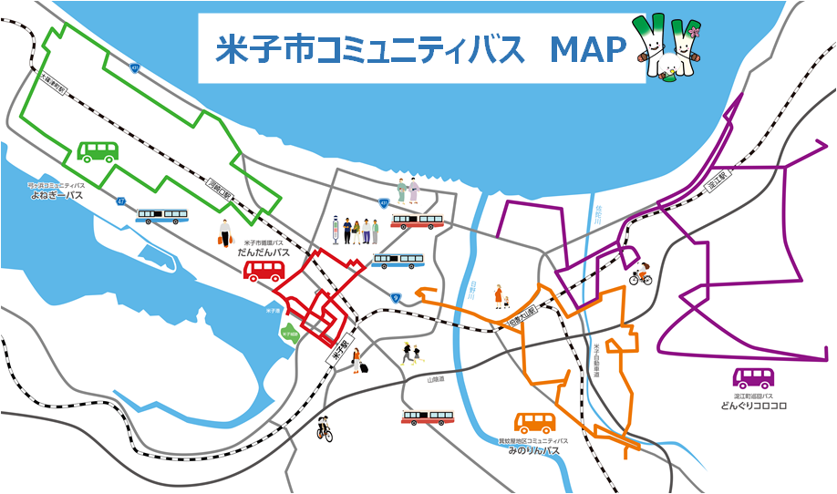 米子市では、市の施設や病院、買い物などに気軽に行くことができるように、市中心部を走る「だんだんバス」と、淀江町内を走る「どんぐりコロコロ」、さらに実証運行として、弓浜地区を走る「よねぎーバス」、箕蚊屋地区を走る「みのりんバス」(実証運行)の運行も行っております。