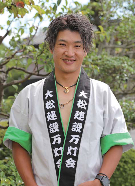 名人戦では、万灯の個人戦である「妙技会」の歴代優勝者など10人が参加。当日は炎天下で風が吹く難しい状況の中で、参加者の中で最多となる5本の竹を接いだ高さ14メートルの万灯を、腰、肩、顎、額の順で持ち上げながら傘と扇を開く難易度の高い構成で安定感のある演技を披露。名人に選ばれた時は「少し風にあおられた感覚もあったので、自分が一番びっくりした」と振り返ります。名人となった今、めざすのはチーム優勝。「これからの世代に伝承していくため、若手中心のメンバーで勝ちたい」と、後進の育成に力を注ぎます。