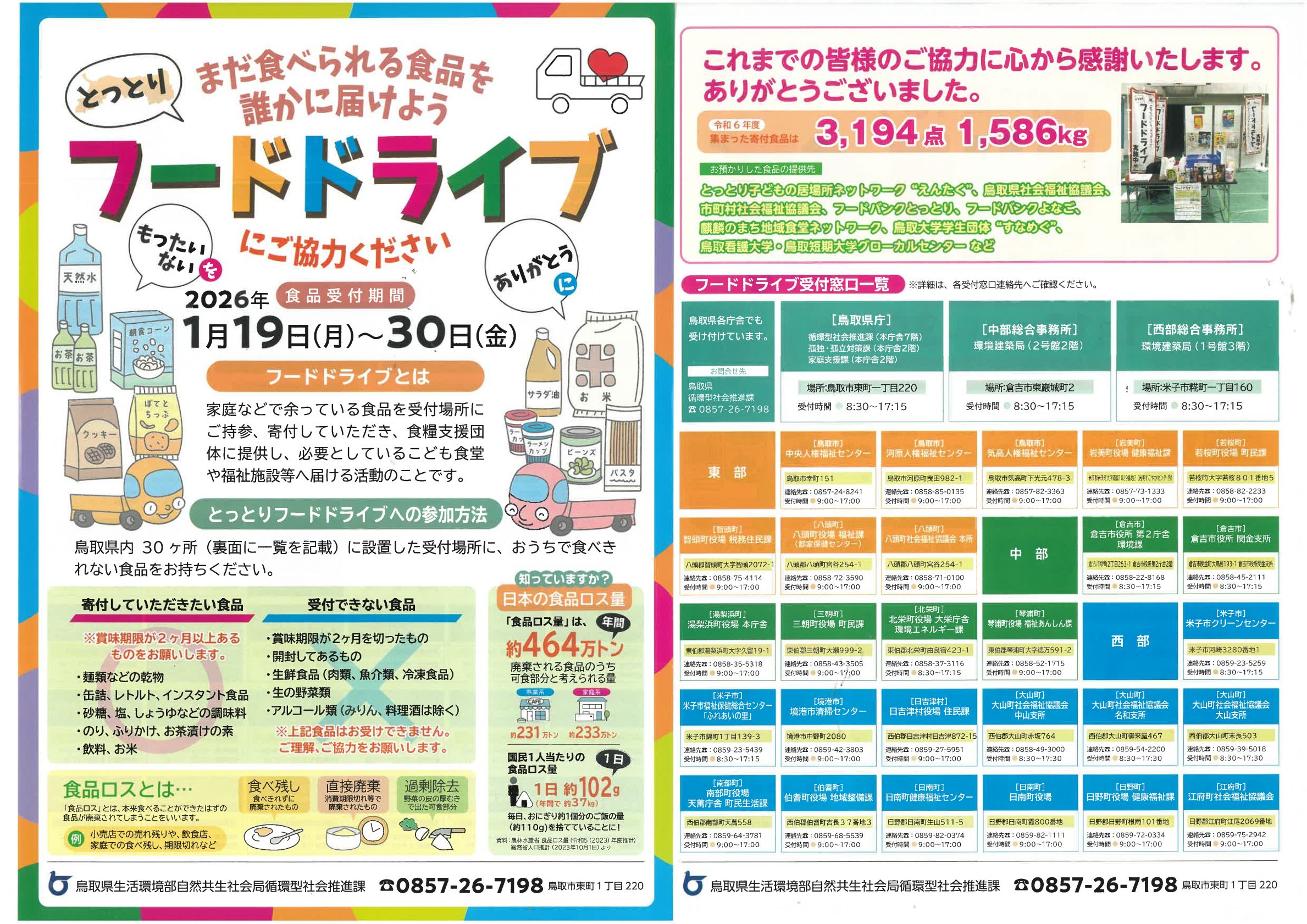 鳥取県と県内市町村が連携して行なう「とっとりフードドライブ」の取り組みを実施します。