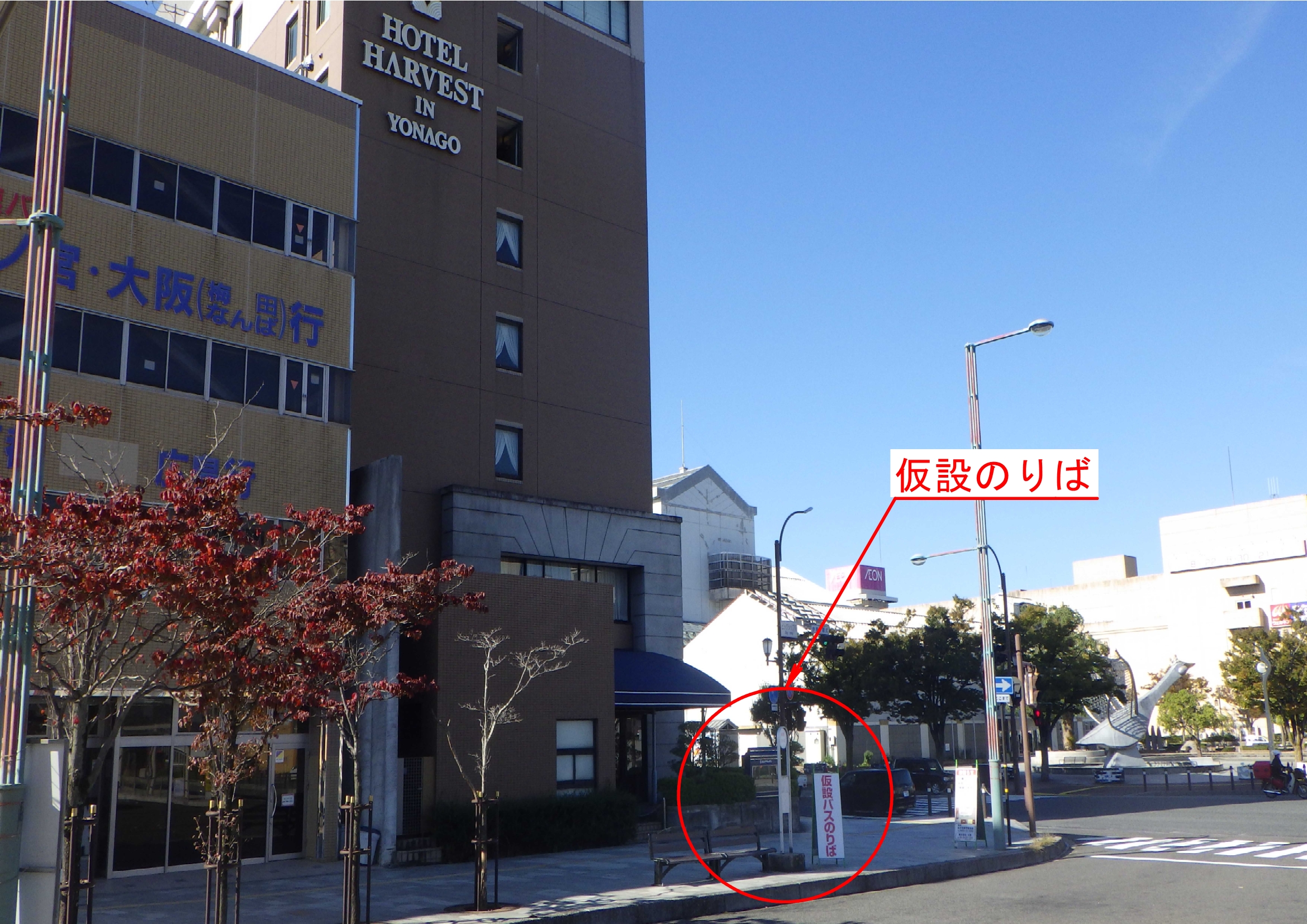現在、米子駅北広場バスターミナルの工事に伴い、5番のりばの乗車位置を「ホテルハーベストイン」正面の「仮設のりば」に変更しています。