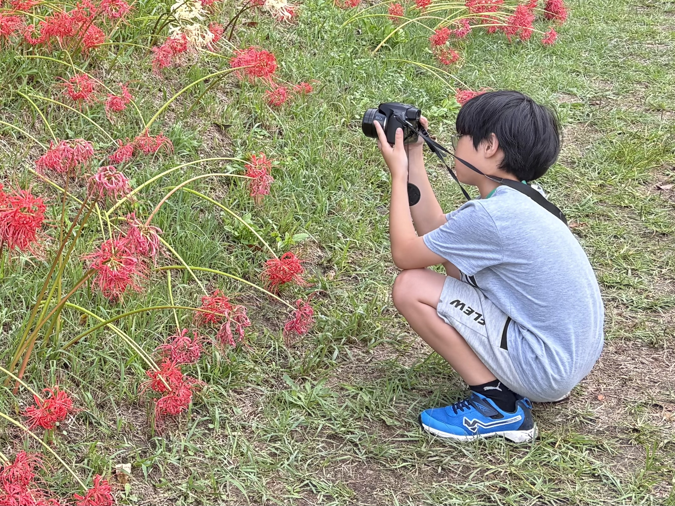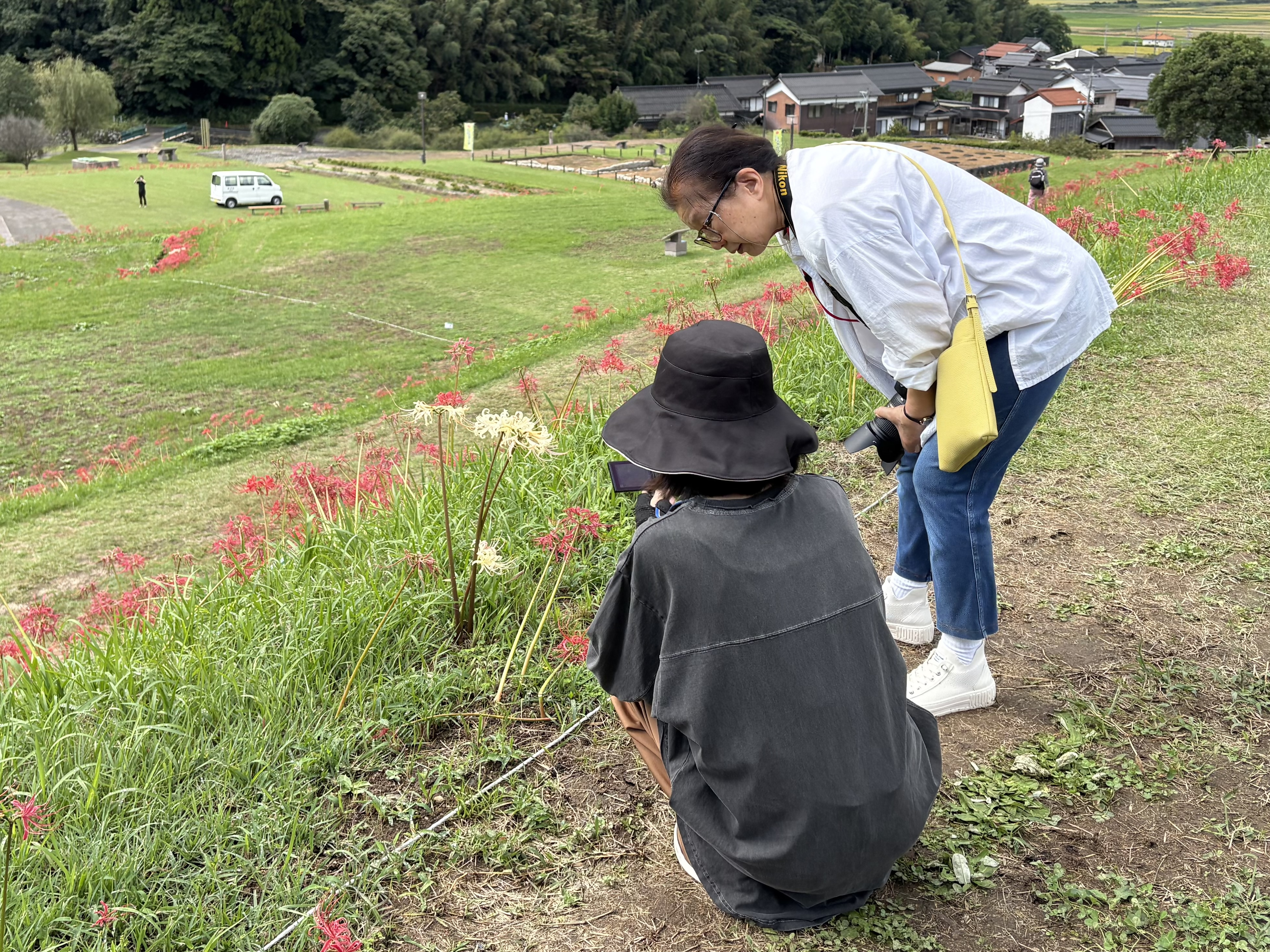 当日は、講師による講座や過去のフォトコンテスト応募作品の解説、撮影会を行ない、参加者は雨上がりの上淀廃寺跡に咲く彼岸花を被写体として熱心に撮影していました。