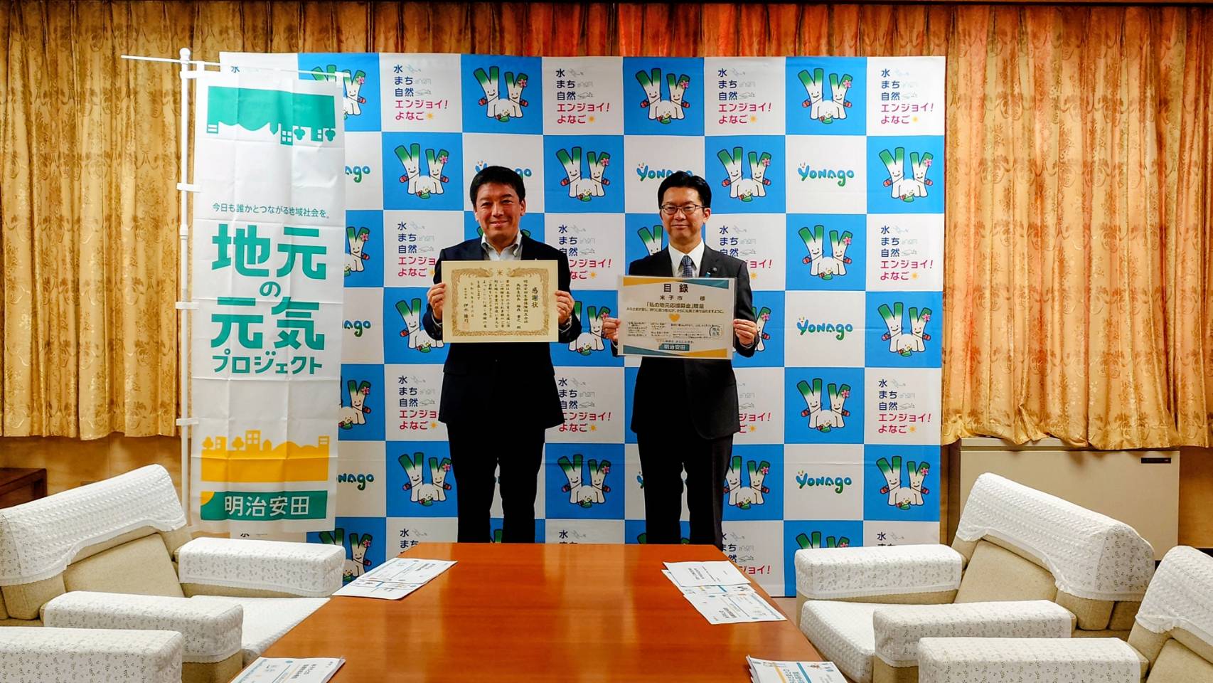明治安田生命保険相互会社様から、さまざまな形で「社会的なつながり」を提供し、より豊かな地域社会づくりに貢献することをめざし展開している「地元の元気プロジェクト」の一環として実施している「私の地元応援募金」により、現金923,895円を寄附いただきました。