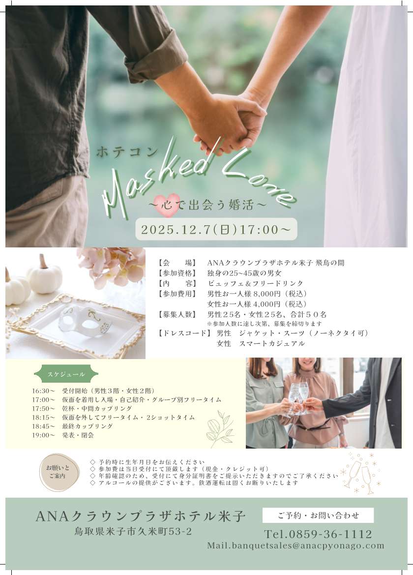 令和7年12月7日(日曜日)、ANAクラウンプラザホテル米子にて婚活イベント「ホテコン Msked Love~心で出会う婚活~」が開催されます。