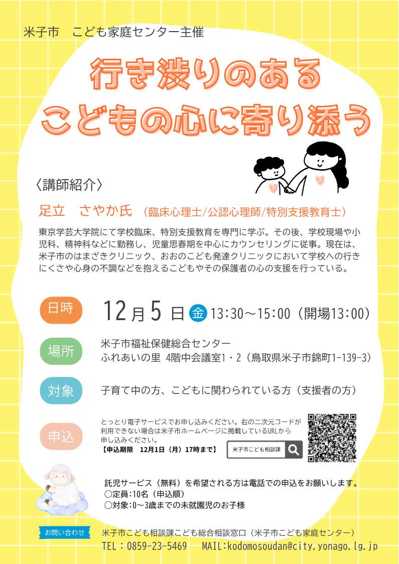 米子市こども家庭センターでは、すべてのこどもが安心して育ち、家庭や地域の中で豊かに成長していくことをめざしています。今年度、その一環として初めて講演会を開催します。