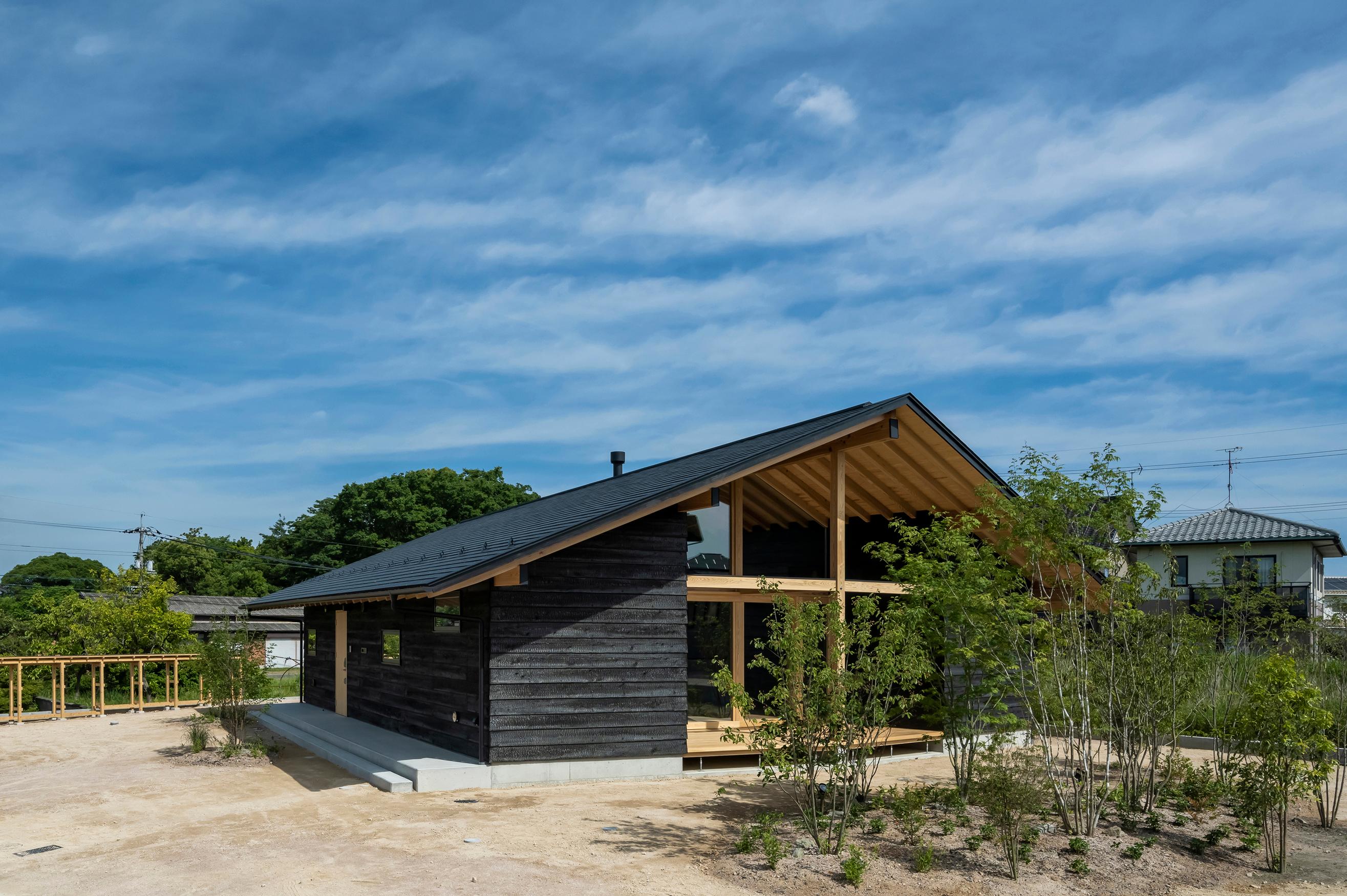 玄関前の長手方向一面の長い犬走りと深い軒は訪れる人に安心感を与え、外装の厚みのある焼杉張り、黒色の鋼板屋根、リビング前の屋根を支える木製構造部材、リズミカルな木製垂木からは、落ち着きや周辺建物への配慮だけでなく、建築デザインとしての質の高さも十分に伝わります。