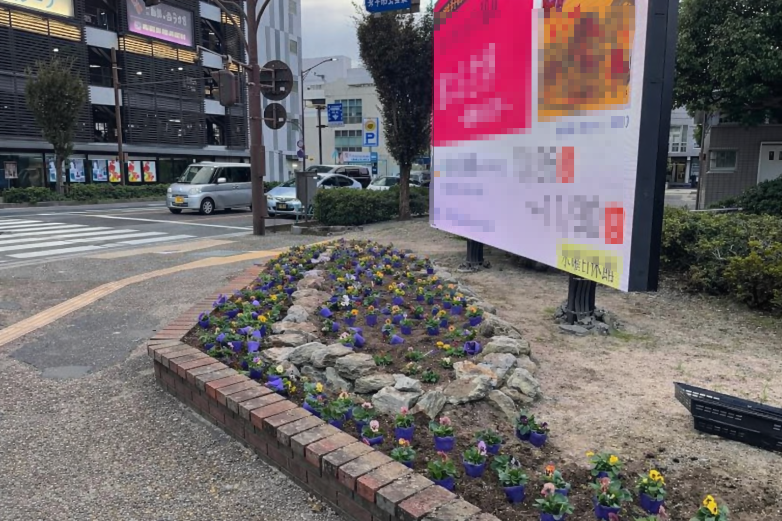 この「お花いっぱい運動」により、花壇には2重3重に花が植えられており、公会堂前バス停の利用者、交差点を行き交う歩行者や自転車・車運転者に対して、潤いと活気を与えています。