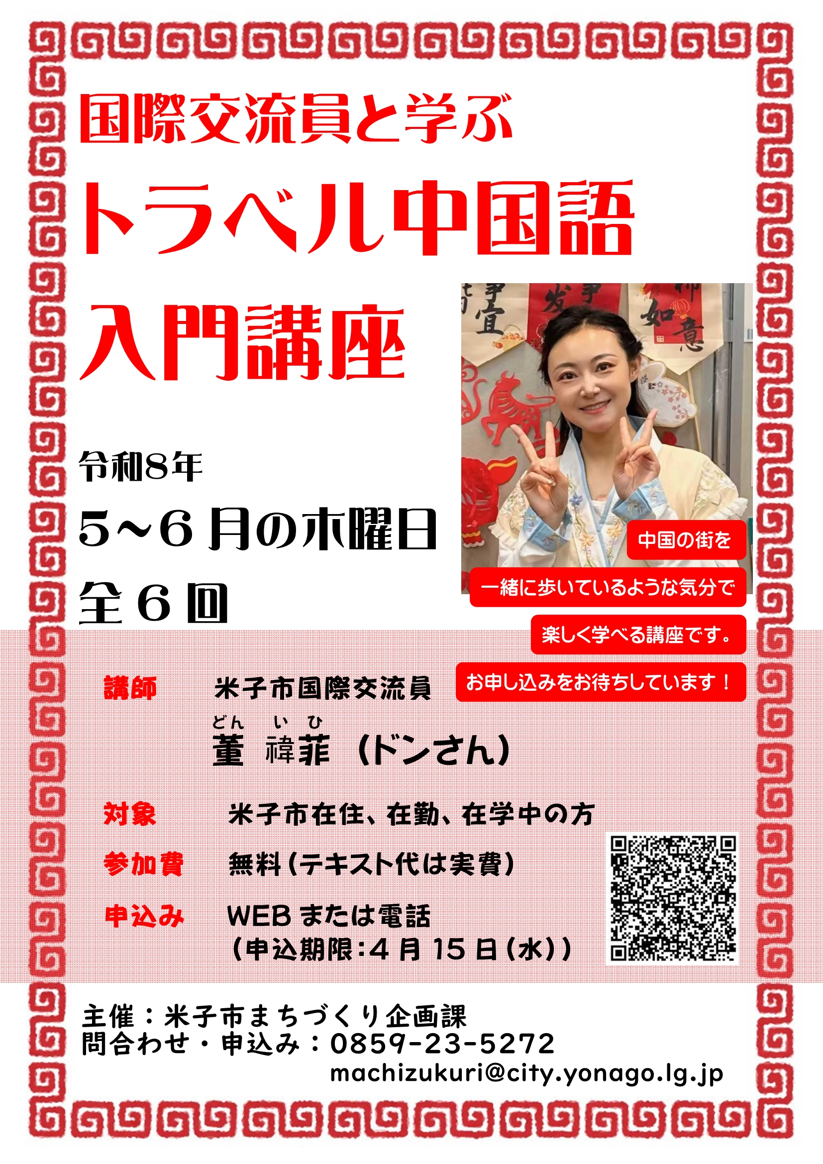 今年、友好都市締結35周年を迎える中国・保定市出身のドン・イヒさんと、語学だけでなく、最新観光情報なども交え中国について楽しく幅広く学ぶ講座です。
